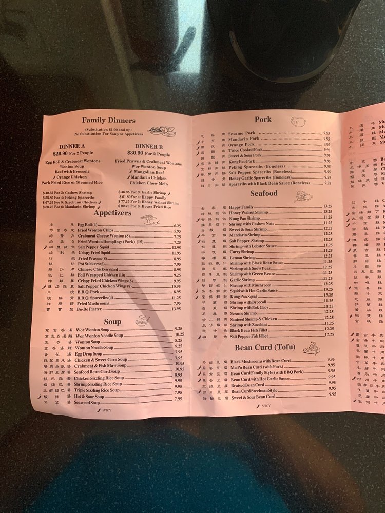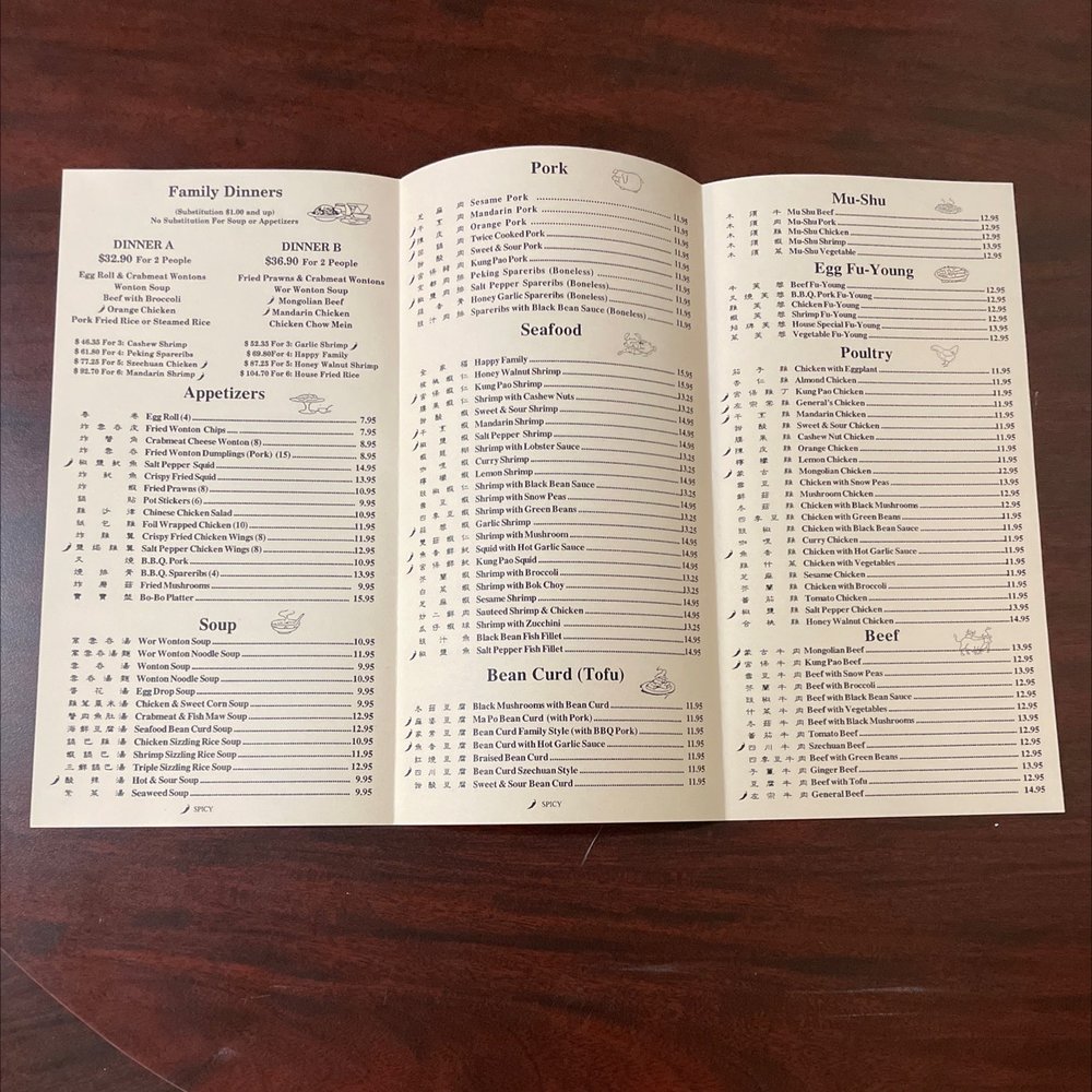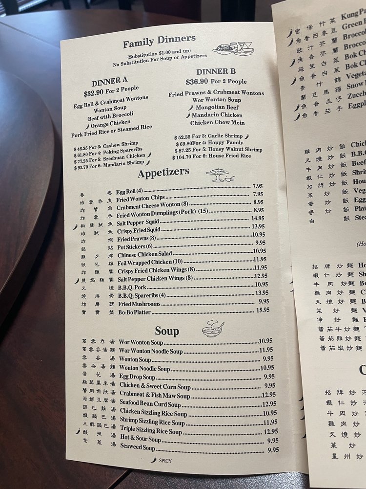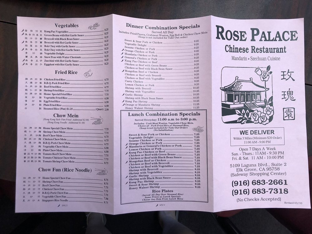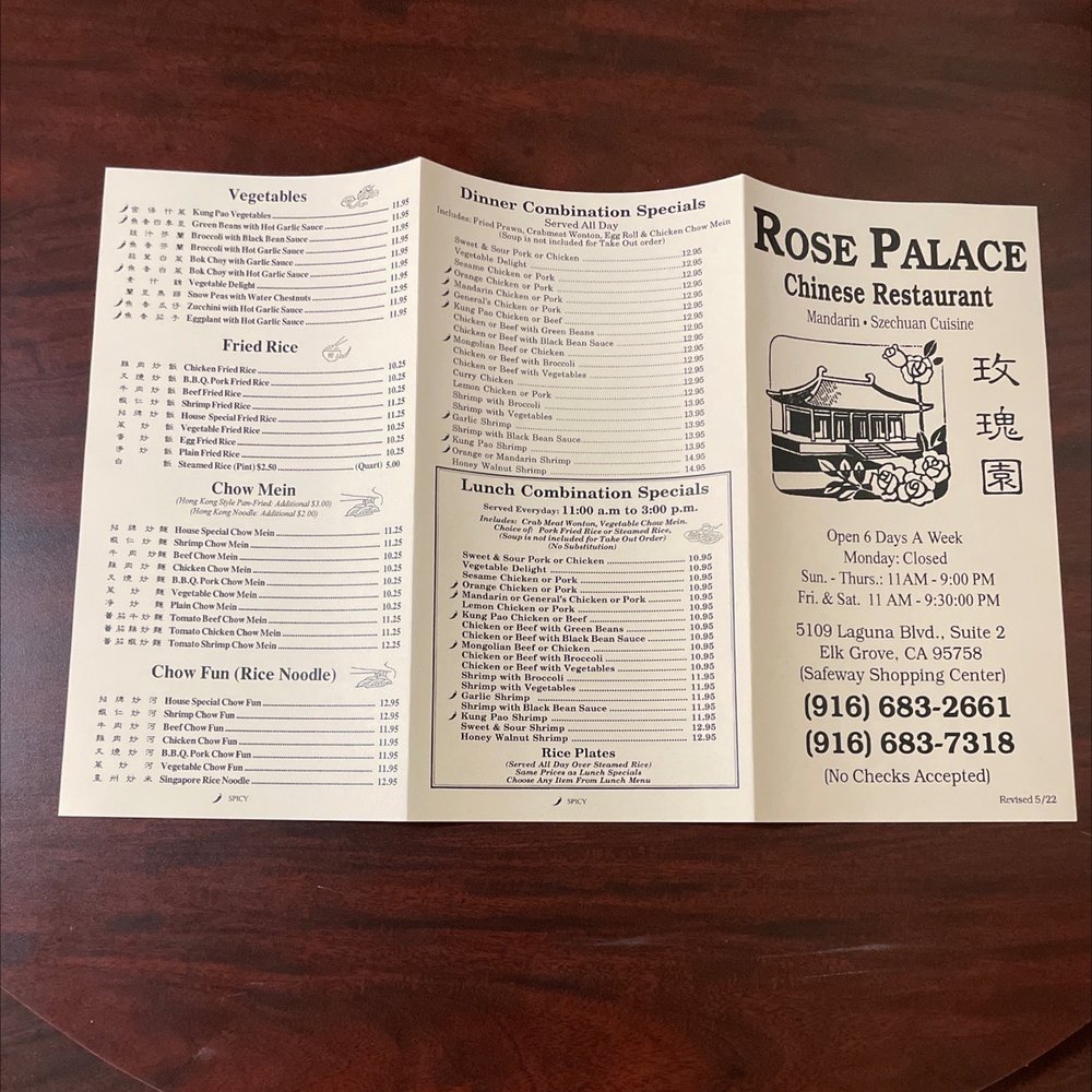 "Introducing the menu at Rose Palace, a hidden gem located in Elk Grove, CA, offering a mix of Chinese cuisine with a focus on seafood. The extensive menu includes appetizers like Pot Stickers, Crabmeat Cheese Wontons, and Salt Pepper Chicken Wings. For soups, options range from Wor Wonton Soup to Seafood Bean Curd Soup. Dinner combos cater to groups with choices like Dinner A for 2 with a variety of dishes. Customers rave about the generous portions, flavorful dishes, and excellent service. With a casual yet classy ambiance, Rose Palace is ideal for family gatherings or casual dining. Don't miss out on the popular dishes like Foil Wrapped Chicken, Mandarin Chicken, and the Crab Wontons. Whether you're craving a comforting soup or a satisfying Chinese feast, Rose Palace is sure to impress."