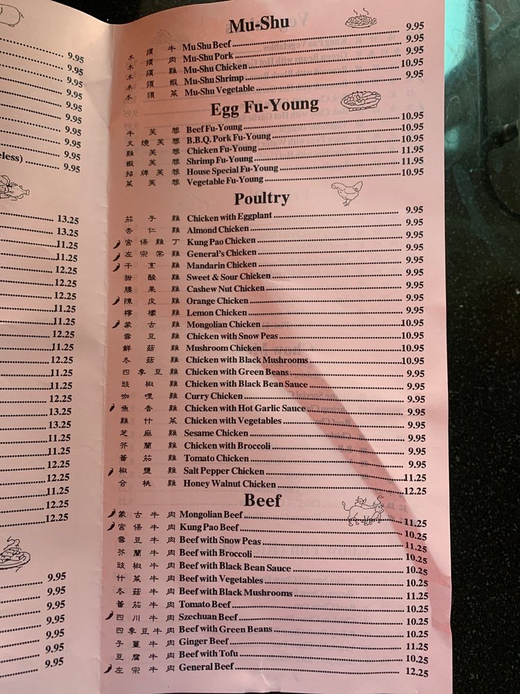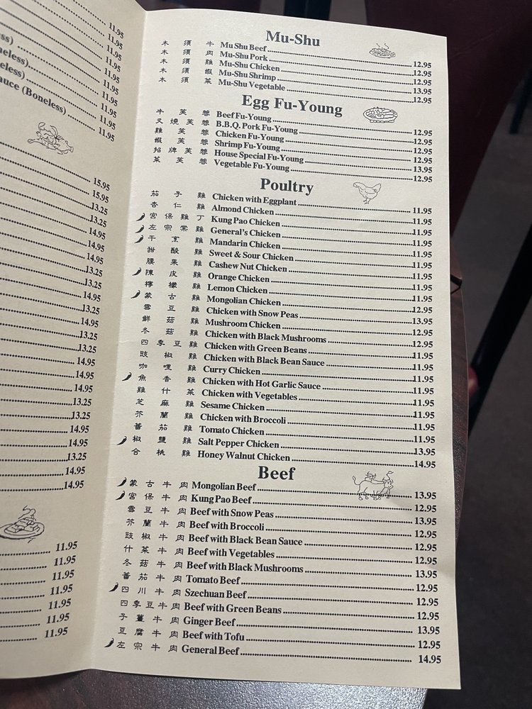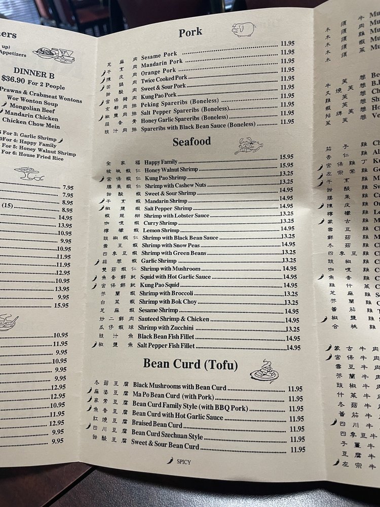 Fried prawns and crab meat wontons, wor wonton soup, mongolian beef (spicy), mandarin chicken (spicy), chicken chow mein.