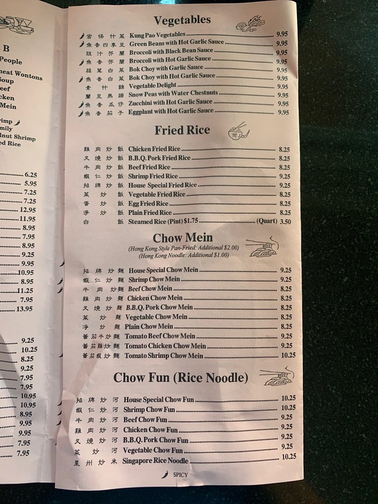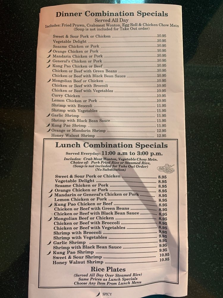 Egg roll and crab meat wontons, wonton soup, beef with broccoli, orange chicken (spicy), pork fried rice, or steam rice.